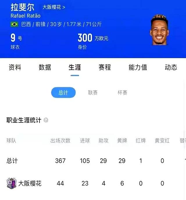 拉唐,30岁,时尚,最近在J联赛大阪樱花效劳,44场23球4助攻,场均进球0.5+。