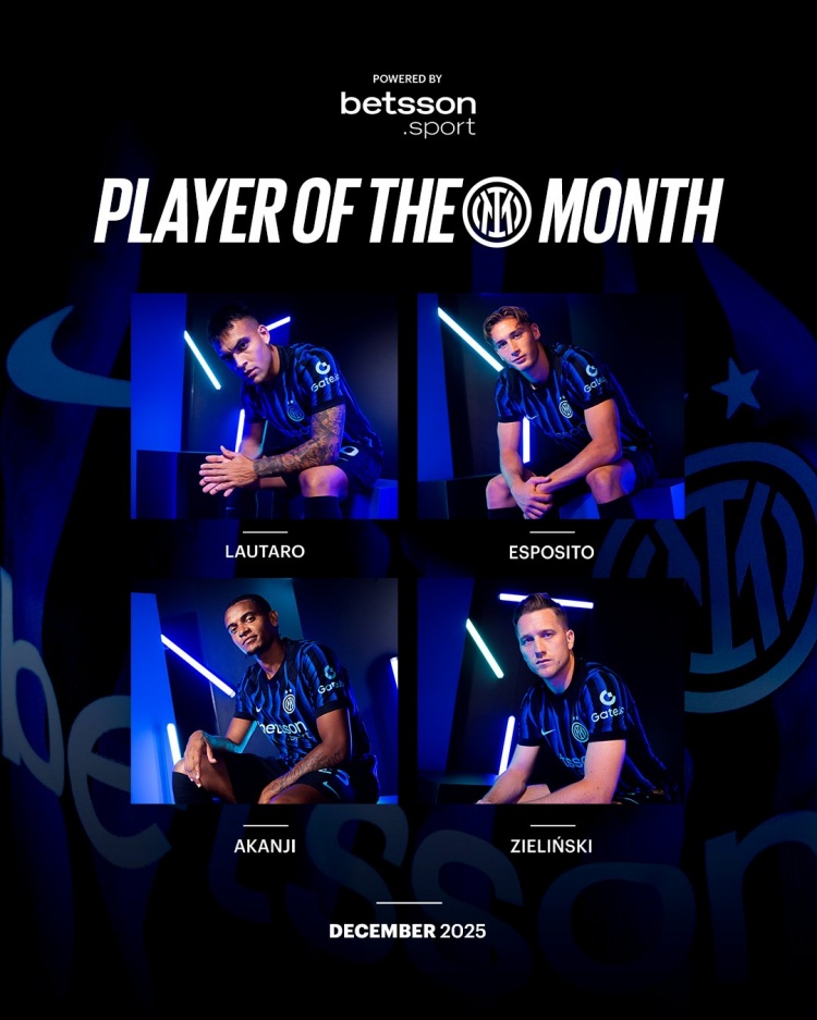 1月5日讯 国米官方公布2025年12月队内最好球员4东说念主候选名单,劳塔罗、皮奥·埃斯波西托、阿坎吉以及泽林斯基入围。