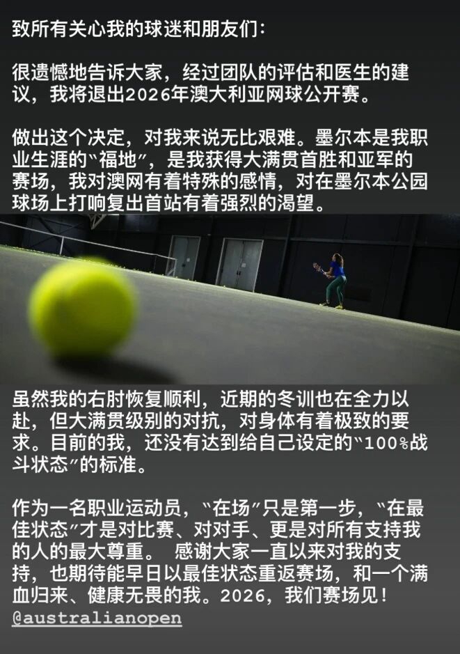 很缺憾地告诉全球,经由团队的评估和大夫的提倡,我将退出2026年澳大利亚网球公开赛。