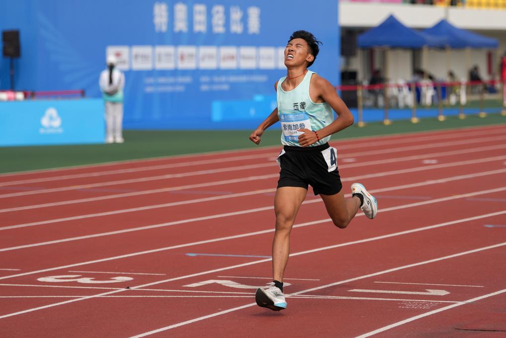 12月11日,索南加参在寰宇残特奥会特奥田径比赛须眉16-21岁组800米决赛第7组比赛中最初冲过尽头。新华社记者 杨朝阳 摄