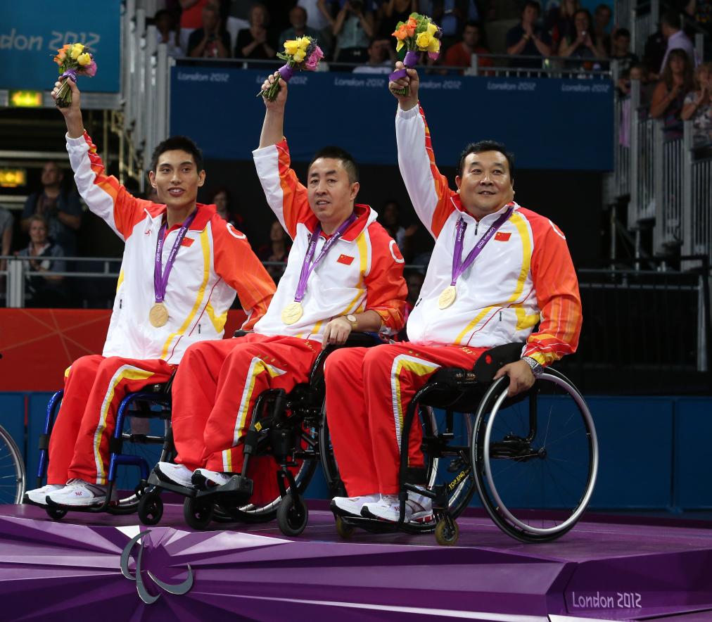 2012年9月7日,在伦敦残奥会乒乓球须眉团体3级决赛中,中国队以3:2校服德国队,获取冠军。图为中国选手冯攀峰、高延明和赵平(从左至右)在授奖庆典上。新华社记者 白雪飞 摄