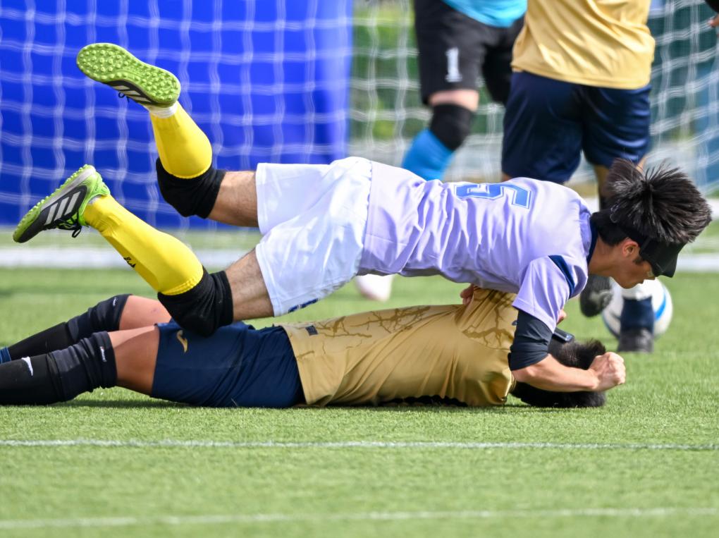 12月14日,在广州举行的寰宇第十二届残疾东谈主畅通会暨第九届极端奥林匹克畅通会盲东谈主足球状貌须眉组小组赛中,天津队1:0校服广东二团队。图为天津队球员范海林(上)与广东二团队球员林显晴在拼抢时跌倒。新华社记者 陈浩明 摄