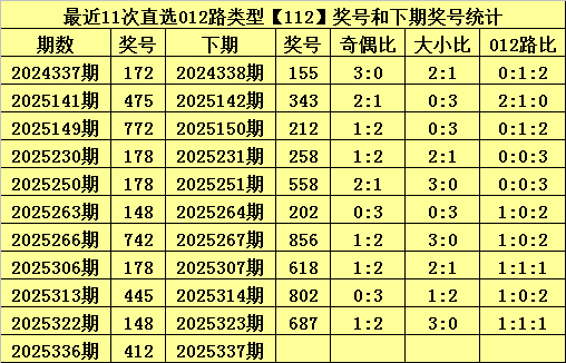 陈设三上期开出奖号为:412,其直选012路类型为112,历史上直选112号码已开出了187次,最近11期分辨开出奖号为:172、475、772、178、178、148、742、178、445、148、412。