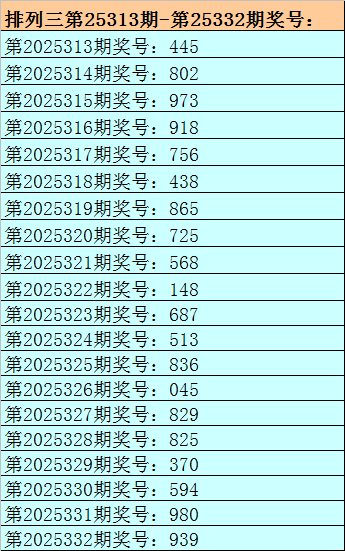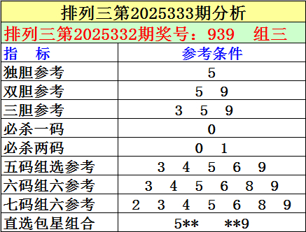 1.成列三最近十期离别开出号码:687-513-836-045-829-825-370-594-980-939,其中有5期奖号开出了上期的重叠号码,本期瞻望第2025332期奖号:939中有重号,参考号码:9。