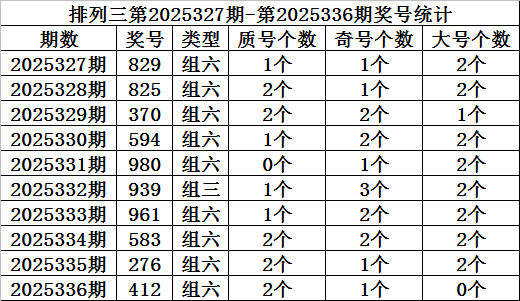 上期回顾:陈设三第2025336期开奖:412,质合比为2:1,奇偶比为0:3,大小比为1:2。