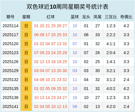 双色球近十周同星期奖号统计表
