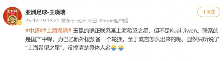 王晓瑞在个东谈主微博写谈:玉昆竟然正有关某上海但愿之星,但不是KuaiJiwen。有关的是国产中锋,为巴乙新外助研讨一个轮流。至于废话如何出来的呢,显然只神话了“上海但愿之星”,没搞明晰具体东谈主名。