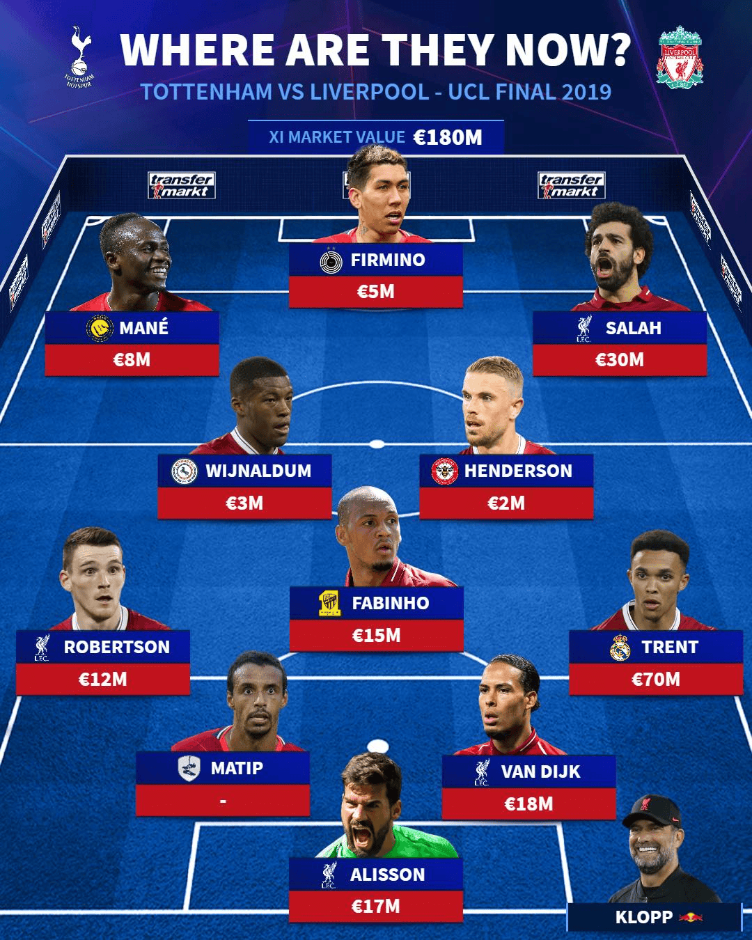 虎扑12月21日讯英超第17轮热刺对阵利物浦的比赛行将在北京时辰1:30开战。德转也在赛前盘货了2019欧冠决赛两队其时首发球员现时的身价情况。