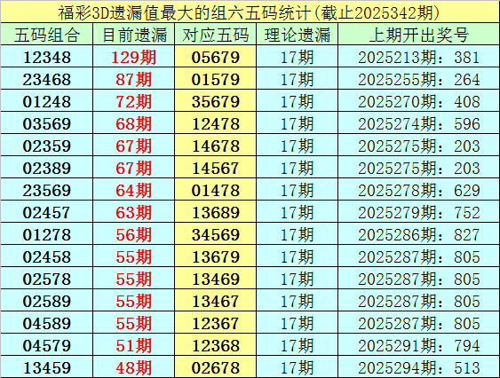 福彩3D五码遗漏组六分析(第2002001期-第2025342期)