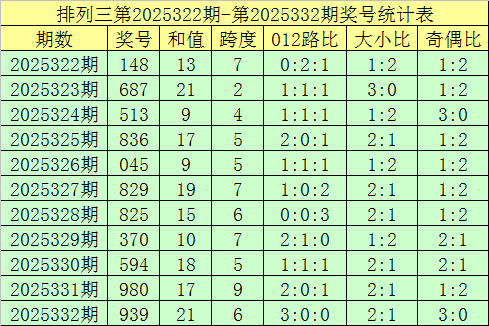 开奖牵挂:摆列三第2025332期奖号开出:939,组选类型:组三,大小比为2:1,奇偶比为3:0,和值为21,跨度为6。