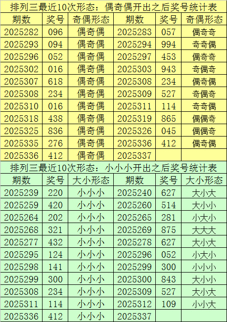 罗列三最近10次同期开稀奇偶花样:偶奇偶和大小花样:小小小时其奖号分手为:434-034-030-432-030-212-210-410-432-234-412,下期分手开出号码为:954-347-044-534-842-686-941-242-627-527,详备统计见下表: