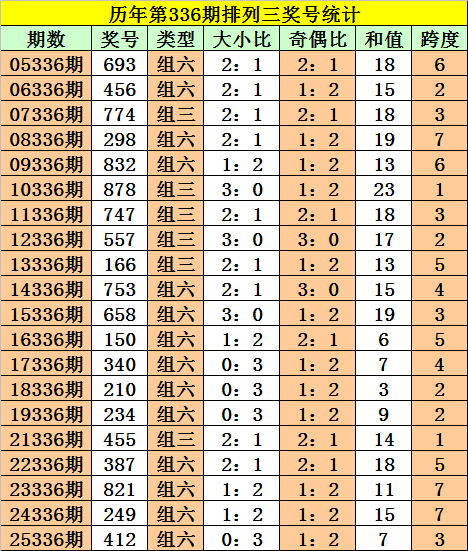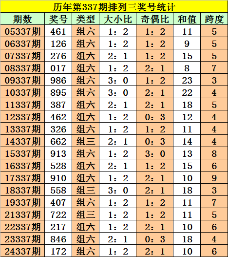 积年第337期奖号中:组三开出3次,组六开出16次。组三较少,本期真贵组三反弹。